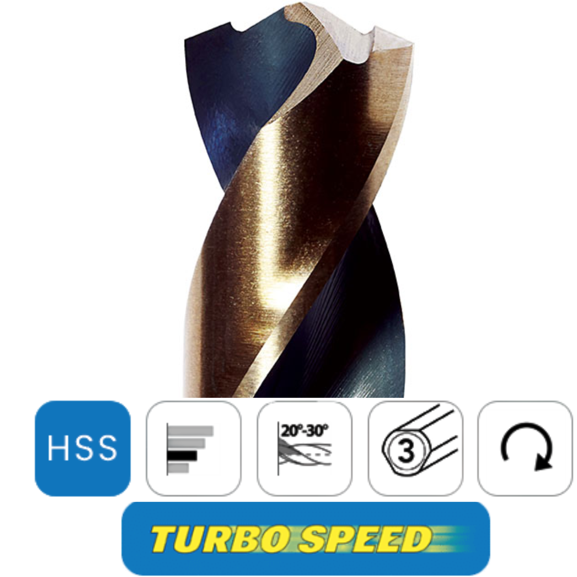 Ostrze wiertła TURBO SPEED umożliwia precyzyjne centrowanie i łatwe prowadzenie bez ślizgania, bez punktowania, również na zakrzywionych powierzchniach. Kołnierz tnący jest zaprojektowany w taki sposób, żeby krawędź wykonanych otworów była idealnie gładka, czysta bez zadziorów, a otwory precyzyjnie okrągłe. Wiertła TURBO SPEED są idealne do wiercenia wiertarkami akumulatorowymi/przenośnymi. Gwarantują bardzo szybkie i łatwe wiercenie przy małym nacisku co przekłada się na zmniejszony pobór energii elektronarzędzia. Dodatkowo 3-płaszczyznowy uchwyt zapobiega wyślizgiwaniu się wiertła z zacisku. Gwarancja stabilnego i bezpiecznego chwytu, zwłaszcza w przypadku użycia zacisków bez kluczy, lepsze przeniesienie mocy.